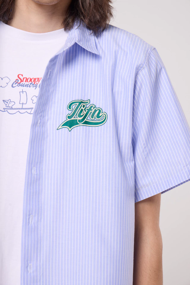 Lightweight poplin short-sleeve shirt with sky/white pinstripes. Official screen prints on chest and back ⚾🐶.