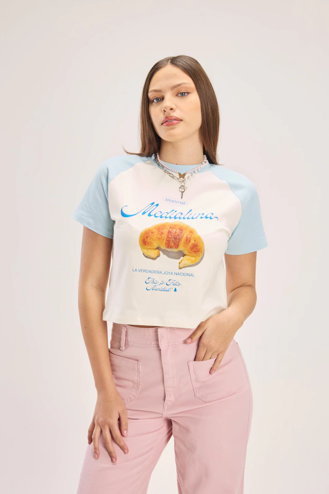 Remera Crop de jersey con elastano, mangas raglán cortas en celeste y estampa DTG tan detallada que te van a dar ganas de darle un mordisco 🥐💙.