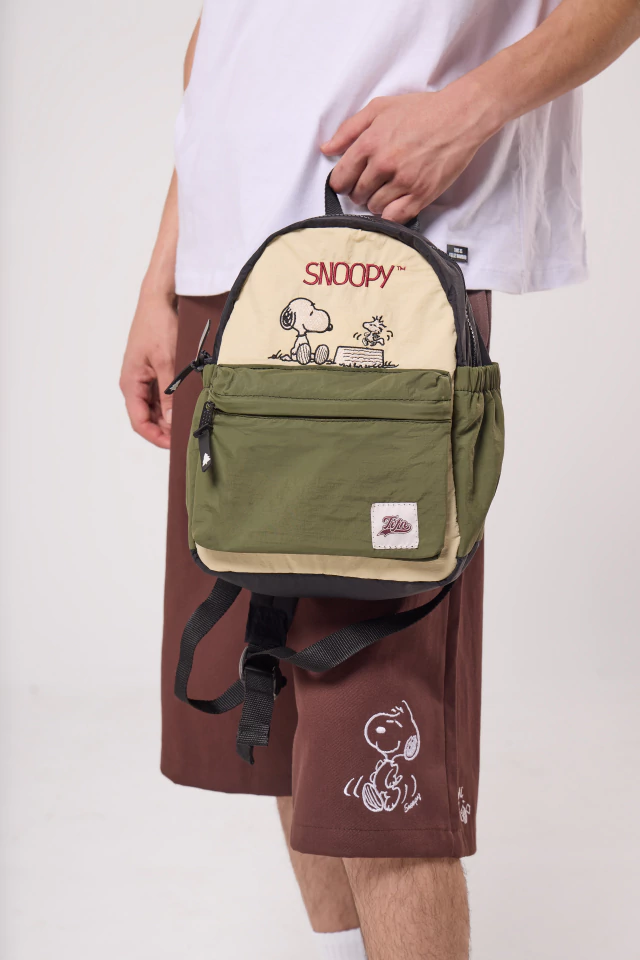 Mochila de nylon con interior forrado. Bolsillo frontal y acceso superior con cierre. Detalles de Snoopy bordados 🎒🐶.