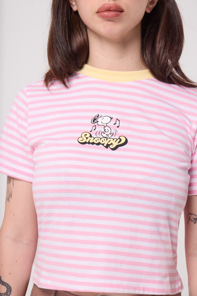 Remera crop de algodón suave, rayas rosa/blanco y cuello amarillo. Estampa serigráfica al frente con Snoopy bailando 🎶🐶.